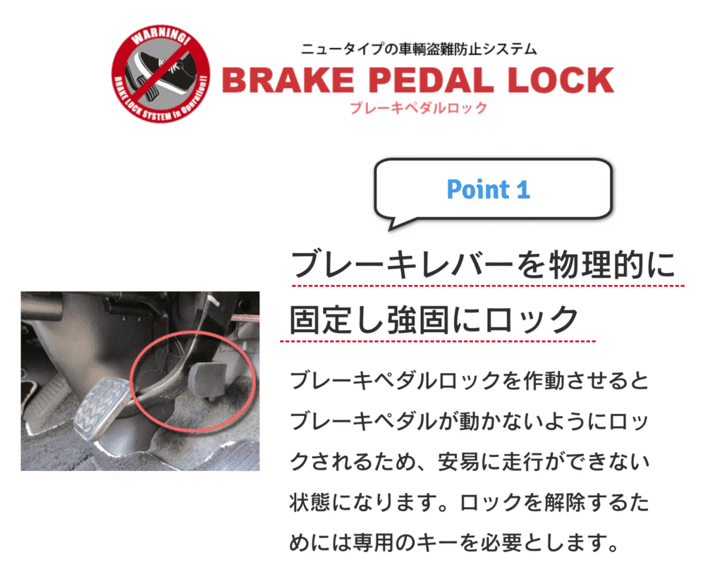 最新の電子セキュリティと合わせて導入を検討したいのが、原始的でありながら非常に効果の高い物理的な盗難防止グッズです。中でも、「ブレーキペダルロック」は、強固な防犯性能と犯人への視覚的な抑止効果を兼ね備えた、コストパフォーマンスに優れるアイテムです。